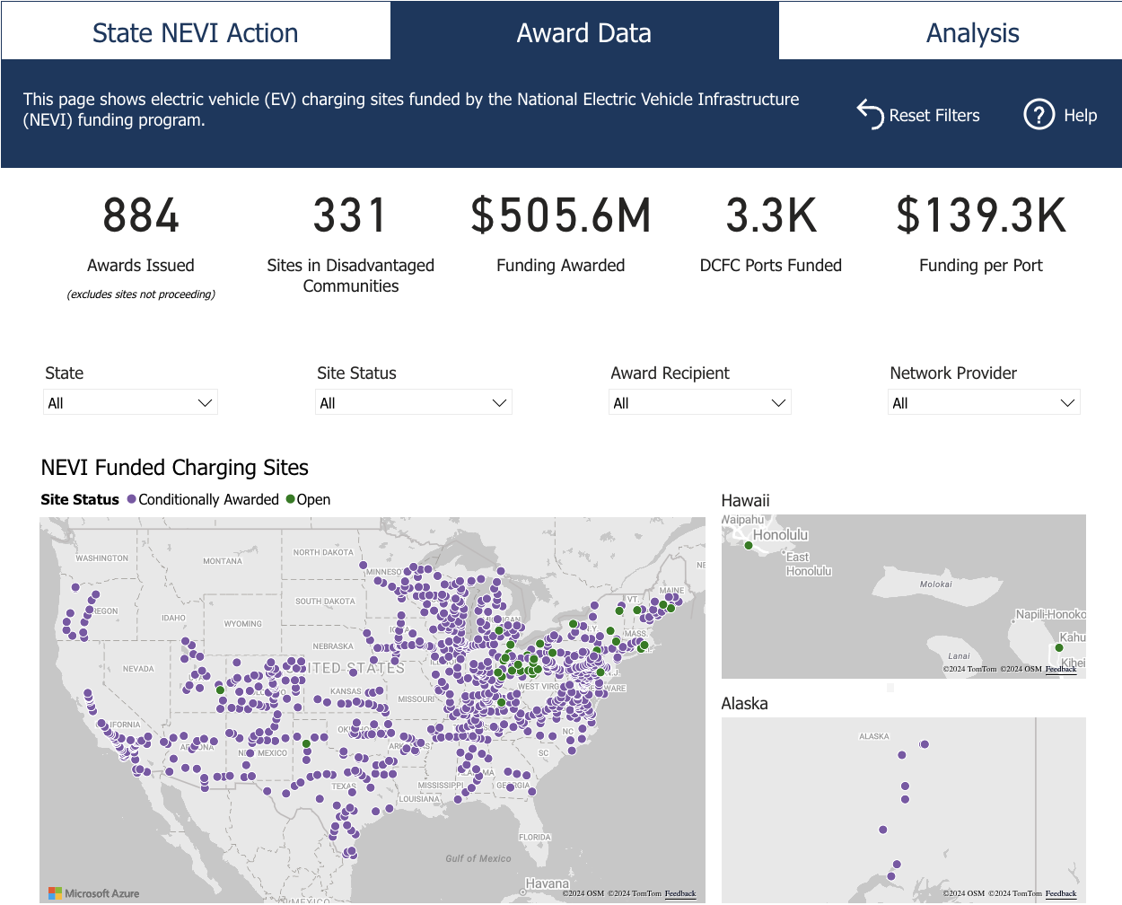 The NEVI Awards Dashboard is regularly updated with new data as states release new solicitations and award and open additional sites.